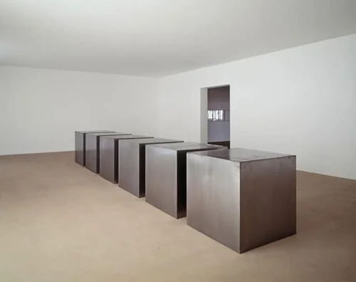 Donald Judd, Untitled, 1969, Kalt gewalzter Stahl, 6 Elemente je 100 x 100 x 100 cm in Abständen von 25 cm, Kunstmuseum Basel (Ankauf 1975), Foto: Kunstmuseum Basel – Martin P. Bühler